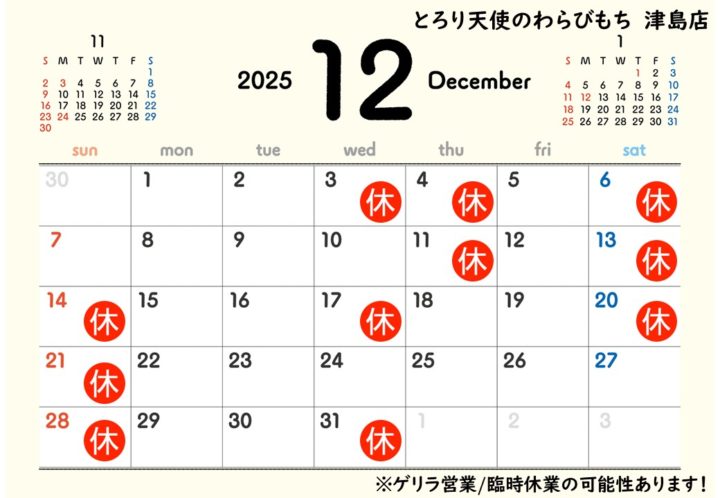 とろり天使のわらびもち 津島店 12月営業日カレンダー