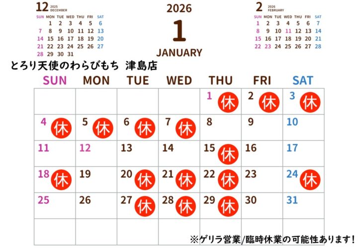 とろり天使のわらびもち 津島店 2026年1月営業日カレンダー